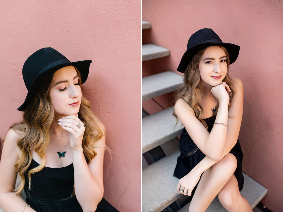 Juliane was in her element traipsing around downtown Sacramento finding beautiful murals and retro buildings to pose in front of. I knew right from the get go at our consultation that this is the type of location fit for Juliane's senior portrait experience. I also knew from our wardrobe consult what look she was going for and the color pallet to look for when location scouting. I always try to find the right background to compliment what the client is wearing.